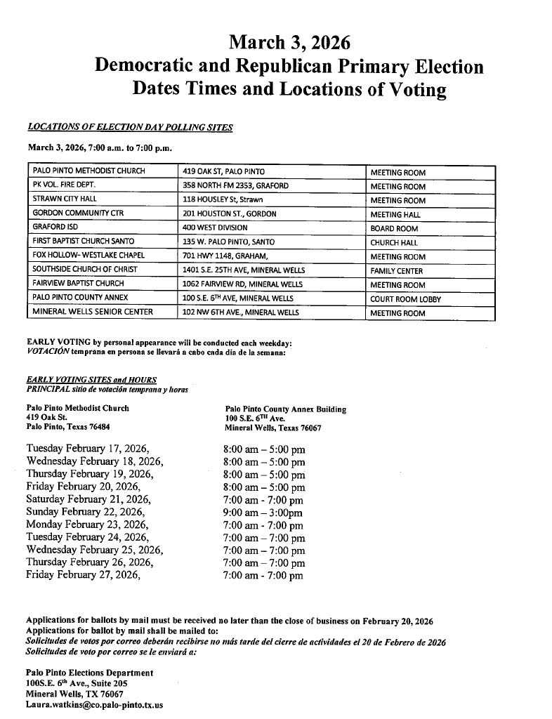 Se notifica por la presente que el equipo automático de tabulación que se utilizará en las Elecciones Primarias que se celebrarán el 3 de marzo de 2026 se probará el martes 22 de enero de 2026 a las 9:00 a. m. en la Oficina Electoral del Condado de Palo Pinto (100 S.E. 6th Ave, Suite 205, Mineral Wells, TX 76067) para comprobar que contará con precisión los votos emitidos para todos los cargos y en todas las medidas.